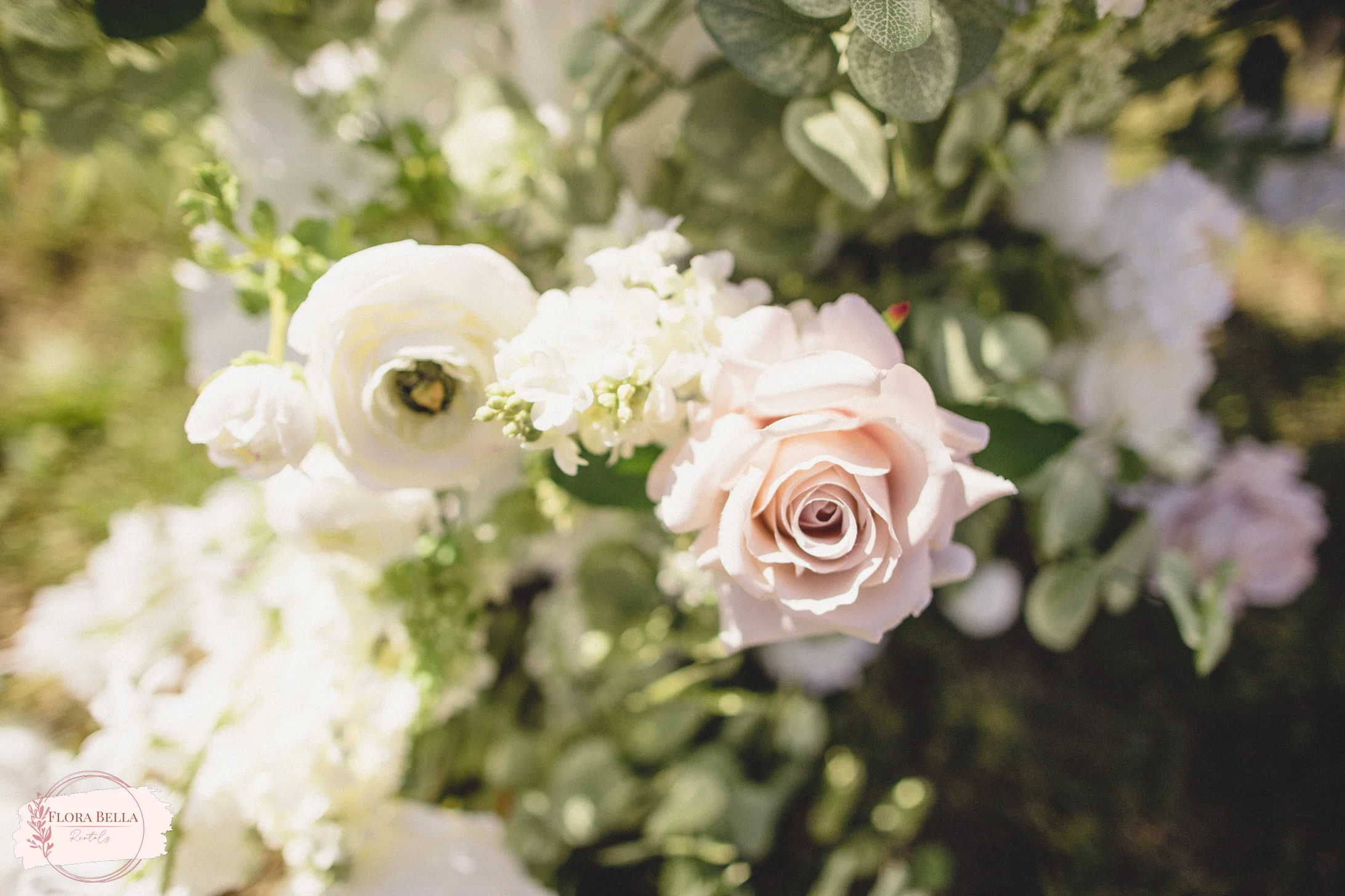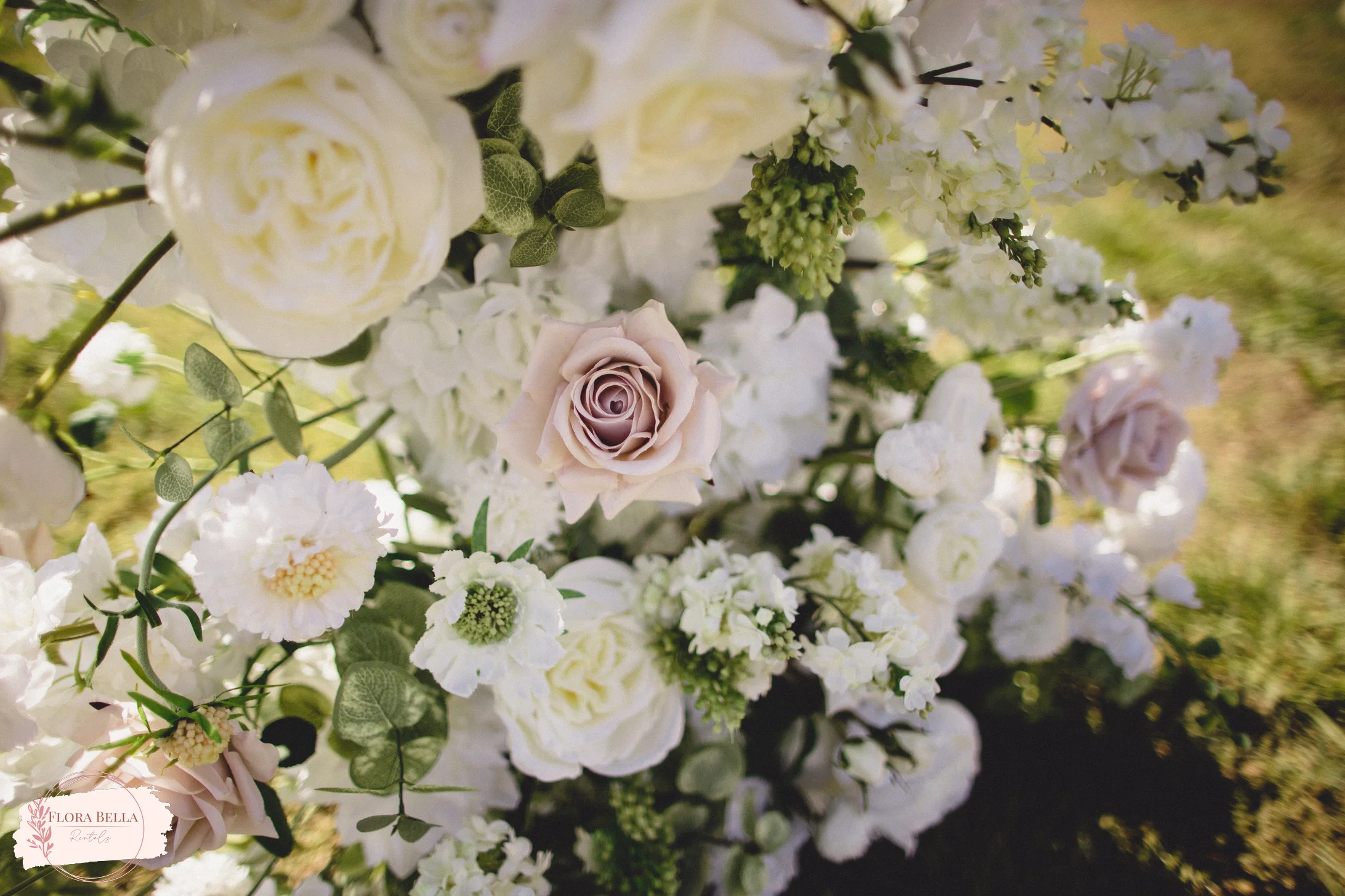 Set the stage for unforgettable moments with our luxurious Eliza floral pillars. We designed these pillars with beautiful soft taupe roses, ivory garden roses and rose buds, white lilac, lisianthus, ranunculus, hydrangeas, ivory scabiosa, delphinium, dahlias, lily of the valley, and eucalyptus. The design is very airy, with a garden style, and a natural color palette of ivory, whites, and taupe.